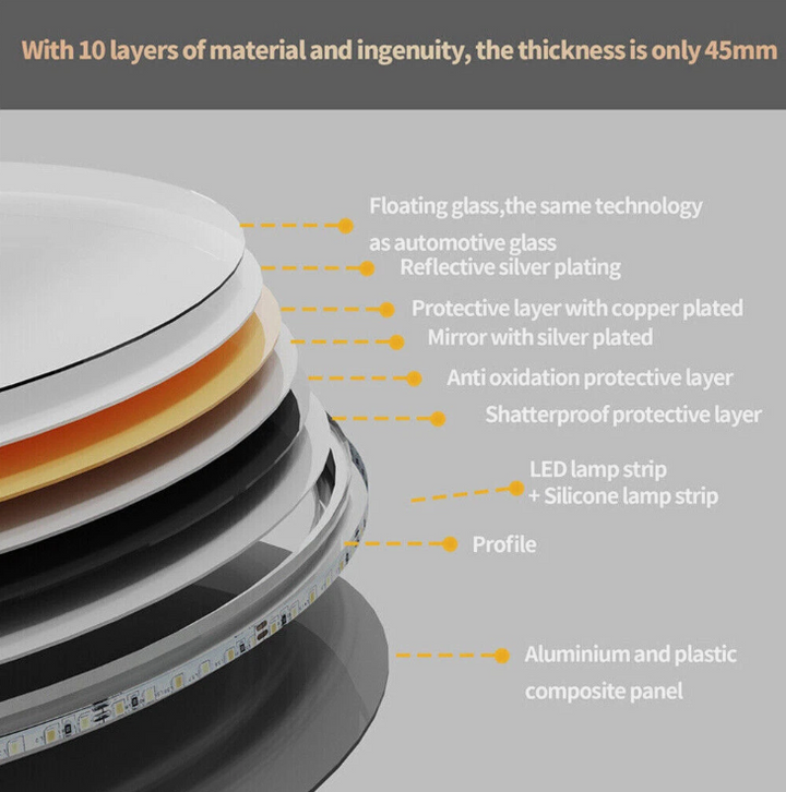 - Material:Aluminium alloy frame + HD glass mirror